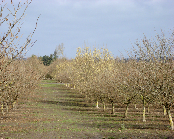 As I look out over the Yamhill hazelnut orchard today, I notice that the golden glow that was there 2 weeks ago is gone. The pollen from the Yamhill filbert trees had been dispersed and the filbert catkins are brown and falling to the ground. Periodically you see a tree that is still glowing with yellow catkins. These are the Epsilon that have late pollen for our Yamhill orchard.